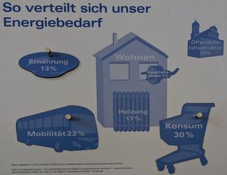 (I) Energiebedarf senken: Die Energiesparschätze werden durch einfache Fragen ermittelt, z.B. läuft der Computer nebenbei, trinken wir Leitungs- statt Flaschenwasser, nutzen wir Rad und öffentlichen Nahverkehr. Wie sich Energiebedarf verteilt ist im folgenden Bild festgehalten.