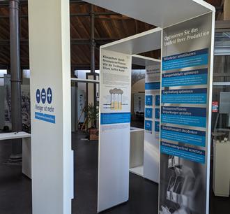 Eine andere Station zeigt, wie der Einsatz von digitalen Zwillingen anstatt Prototypen Ressourcen spart. So können Produkte ganz ohne Prototypenfertigung durch virtuelle Simulation auf z.B. Festigkeit getestet und schrittweise verbessert werden. Das hilft sowohl den Ressourcenverbrauch zu senken als auch die Entwicklungsgeschwindigkeit zu steigen.