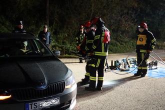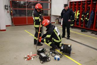 Der Angriffstrupp simuliert den Einsatz von Spreizer und Schneidgerät.