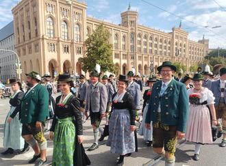 Bereits im September nahmen vier Bergener Trachtenpaare beim traditionellen Trachten- und Schützenumzug anlässlich des Oktoberfestes in München teil. Eingeladen hatte der Gauverband 1, der aus seinen Mitgliedsvereinen eine vielfältige Auswahl getroffen hatte. So starteten wir mit unserer Delegation schon um 7 Uhr morgens mit dem Zug nach München, wo wir uns dann zu unserem Aufstellungsort begaben. Dort hieß es erst einmal lange warten, bis sich dann endlich kurz vor 12 Uhr auch unser Teil des Festzuges in Bewegung setzte.