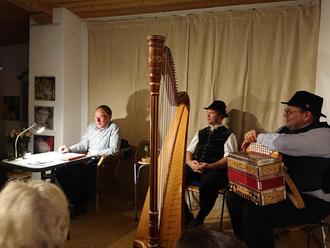 Zwischen den verschiedenen "Gängen" des literarischen Menüs sorgten die beiden Herzblutmusiker Johannes Fischer (Harfe), seines Zeichens Harfenbauer, und Christian Lermer (Ziach) für eine wunderbare musikalische Umrahmung und begeisterten die Zuhörer auch mit ihrer humorvollen und ebenso feinsinnigen Art.