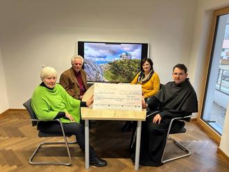 Einen Scheck in Höhe von 1.000, -- € überreichte Bürgermeister Stefan Schneider, der gleichzeitig Geschäftsführer der Hochfelln-Seilbahn ist, an die Katholische Kirchenstiftung St. Ägidius Bergen. Der Spendenbetrag ist ein Teil der Fahrteinnahmen, die am Martini Markt an der Mittelstation der Seilbahn eingenommen wurden. Das Holzschindeldach der Taborkirche am Gipfel des Hochfelln ist in die Jahre gekommen und muss dringend saniert werden. Kirchenpflegerin Waltraud Mörtl, Verwaltungsleiterin Uschi Rosenegger und PfarrverbandsleiterPater Vasile Dior freuten sich sehr über die Spende der Hochfelln-Seilbahn. Gleichzeitig sagte Stefan Schneider zu, die Fahrten für die Handwerker zur Baustelle am Gipfel bis zu einer Höhe von 3.000, -- € durch die Hochfelln-Seilbahn zu übernehmen.