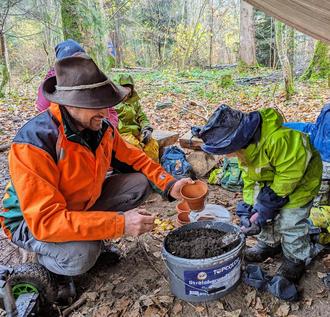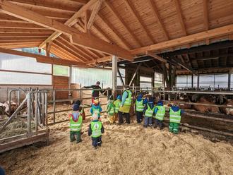 Wir hatten einen schönen Start im Wald Bergens. Für die Eingewöhnung haben wir uns an Emmi Pikler orientiert und nach deren Leitsatz „Lasst mir Zeit“ allen Kindern Zeit gegeben, sich einzufinden. Für einige ist es der erste Besuch im Kindergarten, für viele der erste Waldkindergarten. In unseren gemeinsamen Wochen vor der erfolgreichen Eröffnungsfeier im Oktober waren wir ausschließlich im Wald auf dem Regenplatz und haben uns dort ins Freispiel eingefunden. Zusammen mit Gemeindekindergarten und -Krippe haben wir das St.-Martins-Fest im Kurpark gefeiert. Der für das Waldstück zuständige Förster Christian Leitenstorfer hat uns bereits mehrfach besucht. Wir haben schon einiges über die Aufgaben eines Försters erfahren und unter anderem gemeinsam Baumsamen gepflanzt (Foto). Im November besuchten wir BioBergen. Wir möchten den Waldkindern neben dem Wald auch die Schwerpunkte Ernährung und Landwirtschaft erlebbar machen. Herzlichen Dank an Familie Wimmer für die Unterstützung. Wir durften frisch geborene Kälbchen (Zwillinge) bei ihren ersten Aufsteh-Versuchen beobachten, erfahren, welche Tiere auf dem Hof leben und haben über Lebensmittel vom Bauernhof gesprochen (Foto). Die Geburtstage der Kinder feiern wir mit frischem Brot und Aufstrich, immer abgestimmt auf die Jahreszeit und mit Zutaten aus dem Wald oder aus Bergen, etwa Himbeer-Rotklee-Quark im Herbst (Foto). Nun, da es geschneit hat, wärmen wir uns zwischendurch in der Schutzhütte und machen ein Feuer in unserem Holzofen.