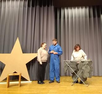Noch wird geprobt mit Sonja Sonnenstrahl (Lisa Panchyrz), Sebastian Sternenputzer (Felix Schlosser) und Wanda, der Wolkenfrau (Agi Hoßfeld)