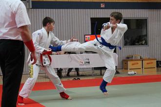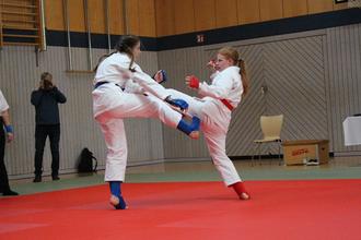 Michelle Büscher (rechts im Bild) kontert den Angriff von Pia Drexler mit einem Fußstoß.