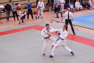 Lukas Wiedemann (blauer Gürtel) setzte im Zweikampf einen Fauststoß zum Körper des Gegners.