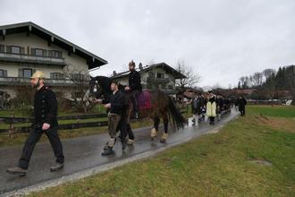 Seit Ende Oktober probten die 16 Buam (plus ein Reservepaar), samt ihrem Wirt und ihrer Wirtin im Vereinsheim des Trachtenvereins und fieberten auf den besonderen Tag hin – ist es doch eine besondere Ehre, wenn man einmal im Leben bei den Pfannenflickern dabei sein darf. Den acht männlichen Pfannenflickern ist seither ein zum Teil stattlicher Bart gewachsen, bei den Pfannenflicker-Dirndln hingegen sind die Kopfhaare mittlerweile so lang, dass sie ihre „Gredei-Frisur“ problemlos befestigen können. Fesch „aufg’kranzt“ sind sie nun am Faschingssonntag durch die Bergener Ortsteile marschiert und haben an zehn Tanzstationen ihr Können unter Beweis gestellt – zur Freude vieler hundert Zuschauer aus Nah und Fern.