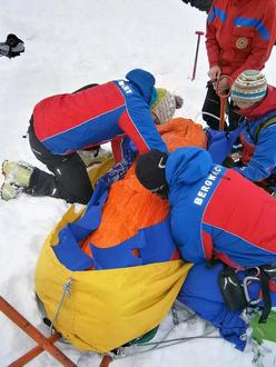 Mitglieder der Bergwacht Bergen bereiten einen Patienten zum Abtransport vor.