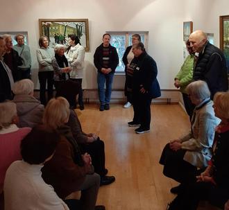 Die ausgesprochen sehenswerte Ausstellung „Malerei und Kunst in schwieriger Zeit“ durfte sich natürlich auch der Heimat- und Geschichtsverein Achental nicht entgehen lassen. In der Galerie im Wirtshaus d’Feldwies hatte der Arbeitskreis Ortsgeschichte der Gemeinde Übersee erstaunlich viele Gemälde sowie Skulpturen zusammengetragen und Annemarie Kneißl-Metz wusste sehr lebendig über die verschiedenen Kunstwerke zu berichten.