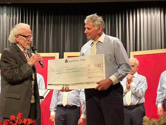 Vorstand Markus Kögel bei der Übergabe des Spendenschecks über 500 Euro an den Ehrenvorsitzenden Klaus Meyer von der Lebenshilfe Kempten.