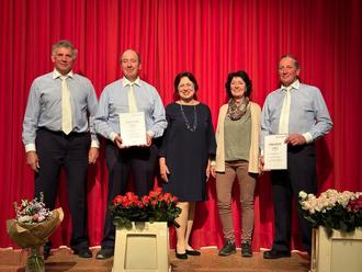 Manfred Mair und Franz Kögel wurden für 40 Jahre Singen im Männerchor mit der Silbernen Ehrennadel vom Chorverband Bayrisch Schwaben geehrt.