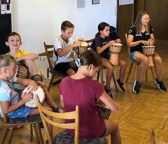 Um 10 Uhr und um 13 Uhr kamen jeweils zwei Gruppen ins Musikheim, wo die Kinder den Umgang und das Musizieren mit Djemben kennenlernten und sogar ihre eigene Trommel herstellen konnten.