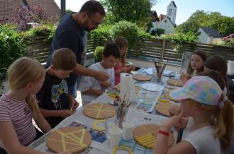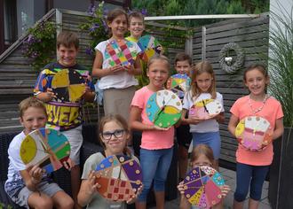 "Auf die Uhren, fertig, los!", hieß es beim Programmpunkt "Wir basteln eine Wanduhr". Die kreativen Mädchen und Jungen konnten aus einem Korkuntersetzer und Acrylfarbe eine ganz individuelle Wanduhr gestalten. Mit Klebeband wurden hierfür Muster abgeklebt und im Anschluss bunt bemalt. Mit Baumscheiben, Filzstreifen oder auch Glitzerperlen wurden die Uhren vollendet. Der Kreativität waren hierbei keine Grenzen gesetzt - jede Uhr wurde zu einem ganz besonderen Unikat.