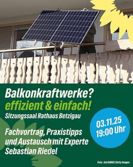 Zu einem Infoabend über Balkonkraftwerke lädt Bündnis 90/DIE GRÜNEN Betzigau herzlich am 03.11.25 um 19 Uhr in den Sitzungssaal des Rathauses ein.