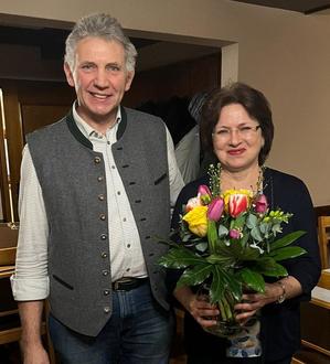 Markus Kögel bedankt sich bei unserer Dirigentin Tatjana Stützinger mit einem Blumenstrauß.