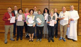 Auf dem Bild von links nach rechts: Albert Hander, Valentin Sauerer, Margot Hübner, Bettina KOlb, Maria Marka, Claus Konrad, Traudl Brüstle, Irmi Karg, Annemarie Jörg, Kornelia Weigel, Stefan Mair, Pater Jacek Filipiuk.