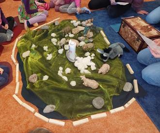 Am 29.01.2023 durften wir die erste Kinderkirche im neuen Jahr feiern. Und natürlich war unser Kinderkirchenmaskottchen „Vreni“ wieder mit dabei! Die Schatzkiste war dieses mal gefüllt mit Schafwolle, die die Kinder zunächst mit geschlossenen Augen fühlen durften. Da war die Überleitung zu der Geschichte vom „verlorenen Schaf“ schnell geschafft. In der Mitte wurden eine kleine Schafherde und ein Hirte aufgestellt. Bei der Mitmachgeschichte bauten die Kinder aus Bauklötzchen dann noch einen Zaun um die Herde und einen Stall dazu. Mit dem Lied „Pass auf kleines Auge was du siehst“ war unsere Geschichte dann zu Ende und wir sprachen die Fürbitten und das Vater unser. Nach dem Segen durften alle Kinder noch ein kleines Schäfchen aus Papier und Wolle basteln. Die Kinderkirchen-Schafherde schmückt ab sofort unseren Kinderkirchenraum!