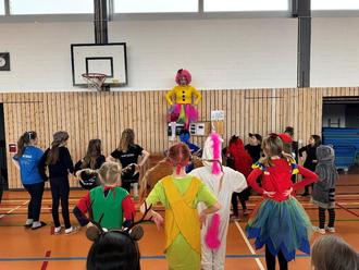 „Helau“ in der Turnhalle Pünktlich am Weiberfasching herrschte im Schulhaus Ausnahmezustand – natürlich im positivsten Sinne! Überall sah man fantasievolle Kostüme, von mutigen Superhelden bis hin zu glitzernden Fabelwesen. Der Höhepunkt des Tages war die gemeinsame Faschingsfeier aller Klassen in der schuleigenen Turnhalle.