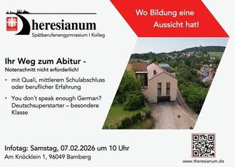 Am Samstag, 07. Februar 2026, 10.00 Uhr, findet ein Informationstag im Bamberger Theresianum statt. Die beiden Schularten Spätberufenengymnasium und Kolleg bieten eine echte Alternative für junge Menschen, die nach dem Quali bzw. dem mittleren Schulabschluss oder nach einer beruflichen Ausbildung die „Allgemeine Hochschulreife“ (Abitur) in drei bzw. vier Jahren erreichen wollen. Im Schuljahr 2026/27 bieten wir wieder eine „besondere Klasse“ für Deutsch als Zweitsprache an.