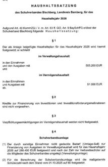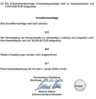 Die Schulverbandsversammlung des Schulverbandes Bischberg hat am 25. November 2025 die Haushaltssatzung für das Haushaltsjahr 2026 beschlossen.