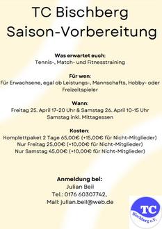 Und zur Vorbereitung auf die Tennissaison gibt es ein Tenniswochenende mit unserem Tennistrainer Julian Beil. Auch Nicht-Mitglieder können teilnehmen.
