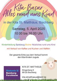 Am Samstag, 5. April 2025, lädt der Elternbeirat der Kita St. Matthäus zum Basar "Alles rund ums Kind" ein. Von 10 bis 16 Uhr darf dann in der Diakonie-Kita am Klingenberg 9 in Bischberg nach Herzenslust gestöbert und natürlich gerne auch gekauft werden: Kinderkleidung, Spielzeug, Bücher und Nützliches rund ums Kind. Bei Kaffee, Kuchen und Waffeln können sich die Besucher_innen stärken. Der gesamte Erlös kommt den Kita-Kindern zugute.