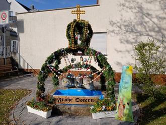 24 fleißige und geschickte Hände von neun Helferinnen und drei Helfern des Obst- und Gartenbauvereins verwandelten das Gerüst in stundenlanger und liebevoller Arbeit in den Bischberger Osterbrunnen. In den Morgenstunden des Freitag stellten die Mitarbeiter des Bauhofs an seinen Platz am Fischbrunnen neben der Hauptstraße auf. Allen Mitwirkenden sagen wir ein herzliches „Vergelt’s Gott“.