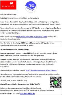 Da unsere Plätze nach 45 Jahren grundlegend saniert werden müssen, haben sich die Mitglieder in einer außerordentlichen Mitgliederversammlung für den Umbau von drei Plätzen mit Ganzjahresbelag entschieden. Da es sich hierbei um eine große Investition handelt sind wir auf jegliche Unterstützung angewiesen. Daher hier unser Spendenaufruf an alle Bischberger Bürger und Firmen!!!