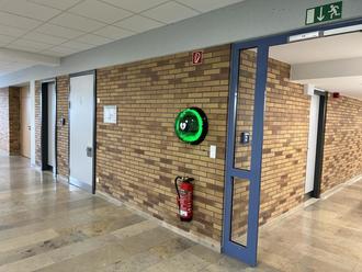 Neuer Defibrillator in der Mittelschule Bischberg im Gangbereich vor der Turnhalle neben der Behindertentoiletten