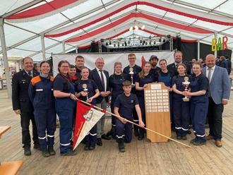 Von links Alois Pfohlmann, Annalena Back, Hanna Schonath, Leonhard Back, Tobias Rottmann, Barbara Pfohlmann, Landrat Hans Kalb, Fenja Waltrapp, Lorenz Pfohlmann, Yannick Dörr, Paula Brehm,, Kdt. Markus Schütz, Emma Brehm, Jugendwart Felix Pfohlmann, Edda Pfohlmann, Ronja Pfohlmann und MDL Holger Dreml. Es fehlt Maximilian Bahr