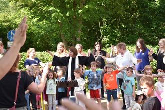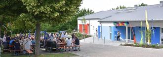 Pfarrerin Jutta Müller-Schnurr segnete mit Unterstützung vieler kleiner Schäfchen und Hirten sowie dem Kinderchor des Gesangvereins Frohsinn Bischberg die Menschen, die in der Diakonie-Kita St. Matthäus arbeiten, spielen und zusammen den Tag gestalten. In ihrer Andacht nahm sie Bezug auf das Symbol der Kita St. Matthäus: ein Schaf mit einem Regenbogen, das für die Sorge um jedes Kind und die Vielfalt in der Kita stehe. Mit vielen Wünschen versehen schwebten dann noch bunte Luftballons bei einer Aktion des Elternbeirats in den Himmel, bevor sich die Festgäste bei Führungen durch den Neubau ein eigenes Bild von der Kita machen konnten und bei zünftiger Musik des Blasmusikvereins Bischberg 1960 e.V., Kinderschminken und einer Zaubershow der Festtag gelungen ausklang.
