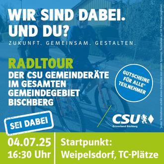 *Die Teilnehmerzahl ist auf 50 Personen begrenzt. Zur besseren Planung meldet Ihr euch nach dem Windhundprinzip vorher an. Anmeldungen erfolgen persönlich bei unseren Gemeinderäten, unserer Vorstandschaft oder per Mail formlos mit Namen an: radltour@csu-bischberg.de