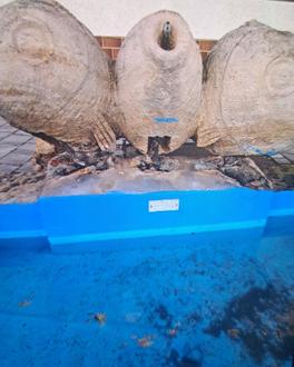 Wie auf dem Bild zu sehen, haben unbekannte Täter dabei die Fisch-Skulptur am Brunnen mutwillig aus der Verankerung gerissen und verschoben. Dabei wurden Wasserleitungen geknickt und beschädigt, sodass die Brunnenanlage derzeit nicht mehr ordnungsgemäß funktioniert. Laut der zwischenzeitlich beauftragten Fachfirma Klesse beläuft sich der Sachschaden auf mindestens 1.800,00 EUR netto!