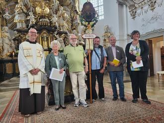 Dabei konnte Alfred Kröner, Hof sein 40-jähriges Pilgerjubiläum und Roswitha Flade ihr 50-jähriges feiern. Die Wallfahrtsführerin Bernadette Muckelbauer bedankte sich bei den Beiden für ihre Treue zur Heiligsten Dreifaltigkeit und wünschte ihnen weiterhin Gesundheit für noch viele weitere Jahre. Diese Wallfahrer sind ein Vorbild und Urgestein der Wallfahrt. Ohne sie könnte die Wallfahrt nicht stattfinden. Im Namen des Wallfahrervereins Bischberg überreichten sie und der zweite Vorstand Roland Kröner kleine Präsente als Dankeschön. Auch Pater Lazarus von der Pfarrei Gößweinstein beglückwünschte die Beiden zu ihrem Jubiläum. Nach dem Segen zog die Pilgergruppe aus der Basilika aus, um bis zum Ortsende von Gößweinstein zu ziehen. So konnten sie am Abend wieder in Bischberg zurück, in die Pfarrkirche St. Markus einziehen und die Wallfahrt damit beenden. In der Pfarrkirche wurden noch Marion Exner geehrt, die mindestens 10mal bei der Wallfahrt dabei war und Bernhard Hubert für seine 30malige Teilnahme an der Wallfahrt. Auch ihnen, beides Ausschussmitglieder, dankte die Wallfahrtsführerin für ihre langjährige Treue zur Wallfahrt und ihre Mitarbeit im Ausschuss.