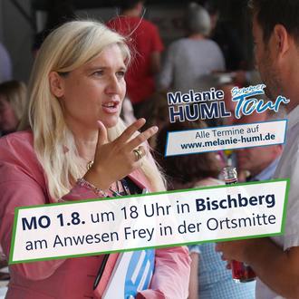 Im Rahmen ihrer Sommertour ist Melanie Huml auch in Bischberg zu Gast: am Montag, den 1. August, um 18 Uhr bei der Grünanlage am Frey-Anwesen, Hauptstraße 51. Alle Termine sind auf www.melanie-huml.de veröffentlicht.