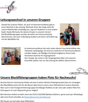 Sowohl bei unseren Flöten, als auch im Kammermusikkreis gab es einen Wechsel in der Leitung. Michaela Groh, die einige Jahre für unsere Flötenkinder zuständig war, zog zum Studieren in eine andere Stadt. Danke Michaela, für deinen Einsatz in unserem Verein!Die Blockflötengruppen werden ab sofort von Verena Stechele übernommen, die auch in Bamberg studiert und schon viel Erfahrung mit der Blockflöte hat.