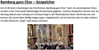Am 22.06 fand in Bamberger das Chorfestival „Bamberg ganz Chor“ statt. An verschiedenen Orten wurden in der Innenstadt halbstündige Chorkonzerte gegeben. Unseren Gospelchor konnte man am Samstag Abend unter Leitung von Christian Popp in der Martinskirche hören. Die Kirche war voll besetzt, die Leute haben fleißig mitgesungen, mitgeklatscht und wir konnten den ein oder anderen mit dem Ohrwurm „Sing!“ nach Hause schicken!