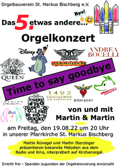 Davor wollen wir uns noch gebührend von ihr verabschieden, und zwar mit dem 5. etwas anderen Orgelkonzert von Martin & Martin mit dem Titel „Time to say goodbye“. Es findet an folgendem Termin in unserer Pfarrkirche St. Markus Bischberg statt: