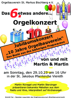 Leider haben wir in Bischberg aktuell keine Pfeifenorgel in unserer Kirche, wir wollen das Jubiläum aber dennoch feiern, und zwar mit dem 6. etwas anderen Orgelkonzert von Martin & Martin. Es findet an folgendem Termin in der St. Jakobus Pfarrkirche in Viereth statt: