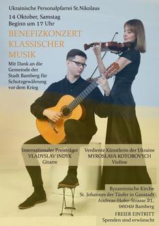17 Uhr | Mit dem Überfall Russlands auf die Ukraine im Februar 2022 haben viele ukrainische Bürgerinnen und Bürger Schutz in der Stadt und im Landkreis Bamberg gefunden. Darunter sind Kinder und Erwachsene, Männer und Frauen, Handwerker und berühmte ukrainische Künstler, wie Myroslava Kotorovych, eine prominente ukrainische Geigerin. Nach 1,5 Jahr Aufenthalt im Bamberg zieht sie nun in ein anderes Land um. Als eine Danksagung im Namen der ukrainischen Flüchtlinge möchten wir Sie zu einem Dankkonzert mit klassischer Musik herzlich einladen. Das Konzert wird von Frau Kotorovych, Herrn Indyk und der ukrainischen Personalpfarrei St. Nikolaus in Bamberg organisiert. |