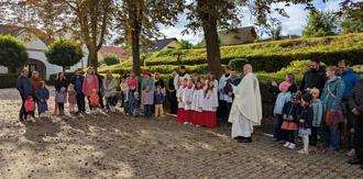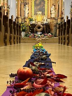 Dieses Jahr begann unser traditioneller Familiengottesdienst an Erntedank auf dem Parkplatz vor der Aussegnungshalle. Pfarrer Bergmann zeigte sich erst gar nicht begeistert von der Idee, bei diesem kalten, grauen, nassen Herbstwetter ins Freie zu müssen. Aber im Gespräch konnten wir vom Kigo-Team ihn doch davon überzeugen, dass der Herbst viele bunte Farben hat. Und wenn man nur richtig hinschaut, findet man auch viele Schätze, die der Herbst bringt: rote Äpfel, braune Kastanien, bunte Blätter und vieles mehr. Deshalb haben wir die Kinder aufgefordert, vor dem gemeinsamen Einzug in die Kirche Herbst-Schätze auf dem Parkplatz und dem Weg zur Kirche zu sammeln. Später in der Kirche durften die Kinder nach einer kindgerechten Version der Schöpfungsgeschichte ihre gesammelten Schätze auf die bunten Tücher im Mittelgang legen. So entstand zusätzlich zum wunderschönen Erntealtar ein farbenfroher Weg durch die Kirche.