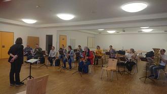 Am Sonntag, 16.10.22, nahmen sich die Eltern der Bläserklassenkinder der Grundschule sowie deren Instrumentallehrkräfte die Zeit, um gemeinsam zu musizieren - ohne Vorkenntnisse! Dazu benötigten sie die Instrumente ihrer Kinder: Saxofone, Querflöten, Posaunen, Klarinetten und eine Tuba. Nachdem der Einzelunterricht, bei dem die Instrumente und einige Basiselemente des Gebrauchs erklärt wurden, beendet war, kamen alle Instrumentalisten im Bürgersaal der Grundschule zusammen. Die Spannung stieg. Schaffte man es, gemeinsam zu musizieren? Frau Monika Rolle-Reuß, unsere Orchesterleitung und Musiklehrerin beider Schulen, gab sich alle Mühe, eine „musikalische Zusammenkunft“ zu bewerkstelligen. Es hat auch geklappt: Die Eltern trafen meistens die Töne und man spielte einige wenige Takte. Die Freude war groß. Frau Alexandra Kappauf, die Rektorin der Schule, lobte die musikalische Leistung der Eltern. Bedeutender fand sie allerdings das Interesse der Eltern an dem Tun ihrer Kinder. Diese wären stolz gewesen (sie waren leider nicht dabei) - nicht nur, weil die Eltern anwesend waren, sondern auch, weil sie (die Kinder) besser spielen können.