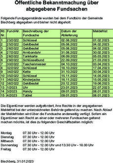 Die Eigentümer werden aufgefordert, ihre Rechte in der angegebenen Meldefrist bei der unterzeichneten Behörde geltend zu machen. Nach Ablauf der Meldefristen wird über die Fundsache anderweitig verfügt. Sofern ein Eigentümer sein Recht an einer oder mehreren Fundsachen geltend machen möchte, ist dies zu folgenden Geschäftszeiten möglich: