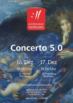 | Programm: G. F. Händel: Concerto Grosso op. 6 Nr. 6 / T. Albinoni: Sinfonia G-Dur/C. Ph. E. Bach: Flötenkonzert A-Dur oder d-moll/ E. Dall ́Abaco: Concerto D-Dur op. 6/12/ A. Vivaldi: Konzert für 2 Celli g-moll, RV 531 // www.orchester-ventuno.de |