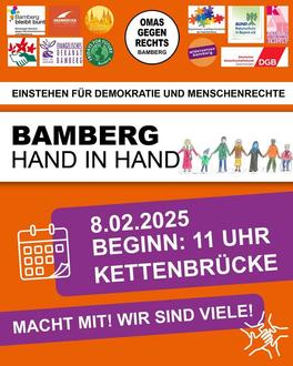 Am 8. Februar um 11 Uhr findet eine Menschenkette für Demokratie und Menschenrechte in der Bamberger Innenstadt statt. Start ist an der Kettenbrücke mit einer Kundgebung. Wir möchten gerne als Evang. Dekanat sichtbar sein, deshalb treffen sich alle "Evangelischen", die mögen, kurz vor 11 Uhr am Schild der Fußgängerzone an der Kettenbrücke, um gemeinsam als evangelische Kirche im Dekanat Bamberg aufzutreten.