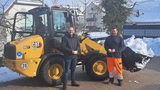 Der neue Radlader im Einsatz: Erster Bürgermeister Michael Dütsch und Stellvertretender Bauhofleiter Markus Schmitt (rechts)