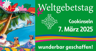 Herzlich laden wir euch zum WGT-Gottesdienst am 7. März um 17 Uhr in unsere St. Matthäuskirche ein. Ebenfalls seid ihr im Anschluss an den Gottesdienst zum gemütlichen Beisammensein mit Gedankenaustausch und Probieren leckerer Speisen von den Cookinseln herzlich willkommen.
