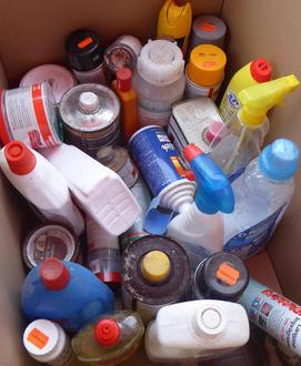 | • | Haushaltsreiniger und Pflegemittel mit Gefahrensymbol (z. B. Abfluss- und WC-Reiniger, Silbertauchbäder, Desinfektionsmittel, Autopflegemittel sowie nicht vollständig entleerte Spraydosen) |