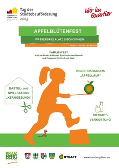 Die Kreuzbergallianz lädt - im Rahmen des Tages der Städtebauförderung am 13. Mai 2023 - zum Apfelblütenfest am Wasserspielplatz in Bischofsheim i.d.Rhön ein.