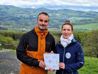 Auf geht’s zum Wanderspaß mit Stempelpass in Bischofsheim i. d. Rhön. Ab sofort erhalten Wanderer und Gäste in der Tourist-Info einen Gipfelpass. Auf vorerst sechs Bergspitzen gibt es eine Stempelstelle, wie Patrick Bauer, 2. Bürgermeister und Laura Rösch, Leitung Stadtmarketing und Tourist-Information, es auf dem Bild zeigen. Schon ab drei Stempeln winkt eine kleine Belohnung.